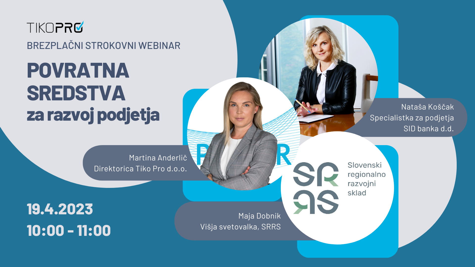 Danes vas razveseljujemo s povabilom na brezplačni ogled posnetka strokovnega webinarja "Povratna sredstva za rast in razvoj podjetja", s strokovnjakinjami iz Tiko pro, SID banke in SRRS!