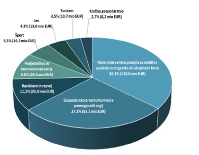 - nova interventna posojila za omilitev posledic energetske ali ukrajinske krize, ki bodo namenjena za investicije in obratna sredstva – skupaj 110 milijonov evrov oziroma 36,1 % razpisanih sredstev. Gre za vzpostavitev novih finančnih instrumentov pri Slovenskem podjetniškem skladu in SID banki na osnovi Zakona o pomoči gospodarstvu za omilitev posledic energetske krize;